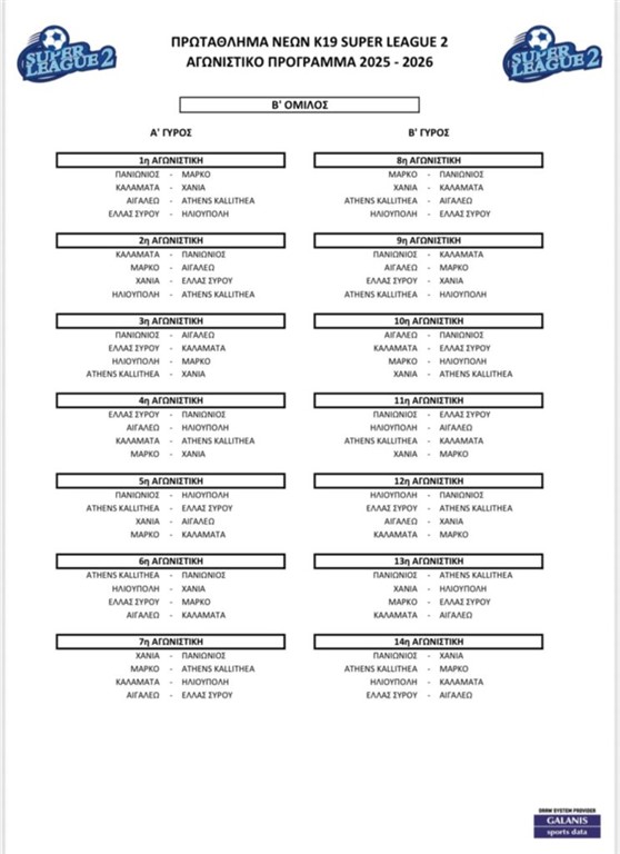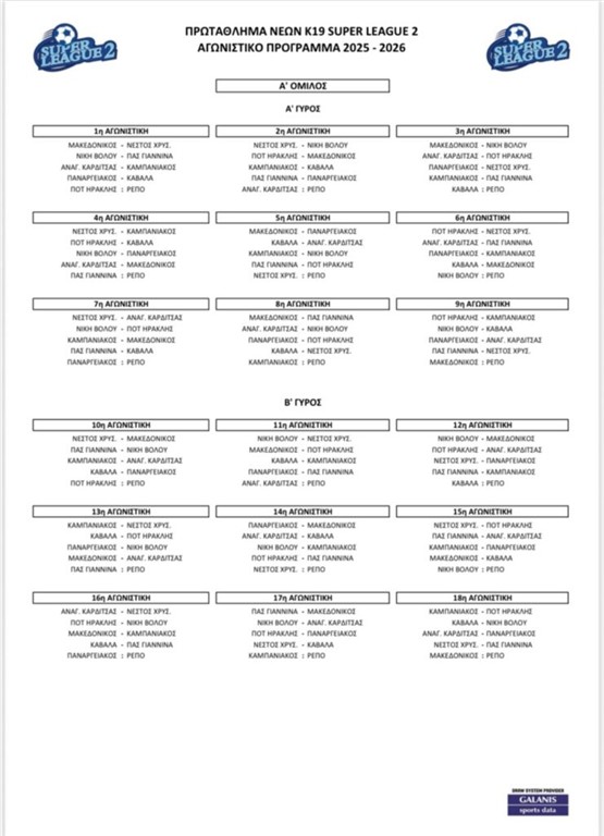 Θα θέλαμε να σας ενημερώσουμε ότι πραγματοποιήθηκε στα γραφεία της διοργανώτριας η ηλεκτρονική κλήρωση του Πρωταθλήματος Νέων Κ-19 Super League 2 αγωνιστικής περιόδου 2025-26 . Η ημερομηνία έναρξης του Πρωταθλήματος Νέων Κ-19 Super League 2 αγωνιστικής περιόδου 2025-26 είναι η 12η Οκτωβρίου 2025.
