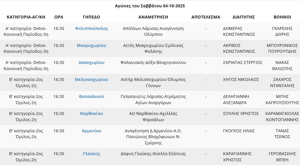 Δείτε αναλυτικά το σημερινό (4/10) πρόγραμμα με τους διαιτητές που ορίστηκαν από την ΕΠΣΛ, σε Α’ DE TOX και Β’ ΕΠΣΛ.