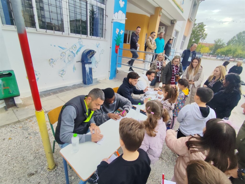 Παρόντες ήταν οι ποδοσφαιριστές Θανάσης Παπαγεωργίου, Σάββας Μούργος, Λαυρέντης Κοσσονού, Πέτρος Μπαγκαλιάνης, ο γενικός αρχηγός Βαγγέλης Νάστος, ο υπεύθυνος Scouting Πέτρος Καριάτογλου, ο υπεύθυνος Επικοινωνίας Δημήτρης Πετρωτός και ο υπεύθυνος Μarketing & Δημ. Σχέσεων Αποστόλης Νταϊλιάνης όπου μαζί με τον αρχηγό της ομάδας έκαναν την παρουσίαση και μίλησαν στα παιδιά για την ιστορική διαδρομή και τις αξίες που πρεσβεύει η «βασίλισσα του κάμπου».