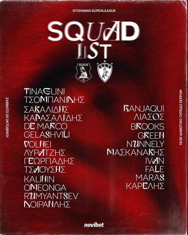 Εκτός αποστολής έμειναν ο Ουαγκέ, ο ανέτοιμος Γκιγιομιέ, οι Λεό και ο Σοφιανός κάνουν αποθεραπεία, οι Γκαλβάν και Αρμουγκόμ που συνεχίζουν το ατομικό τους πρόγραμμα και οι Σαββίδης, Σαλβάνος και Πουρλιοτόπουλος που θα αγωνιστούν με την Κ19, όπως και ο Παπαδημητρίου".