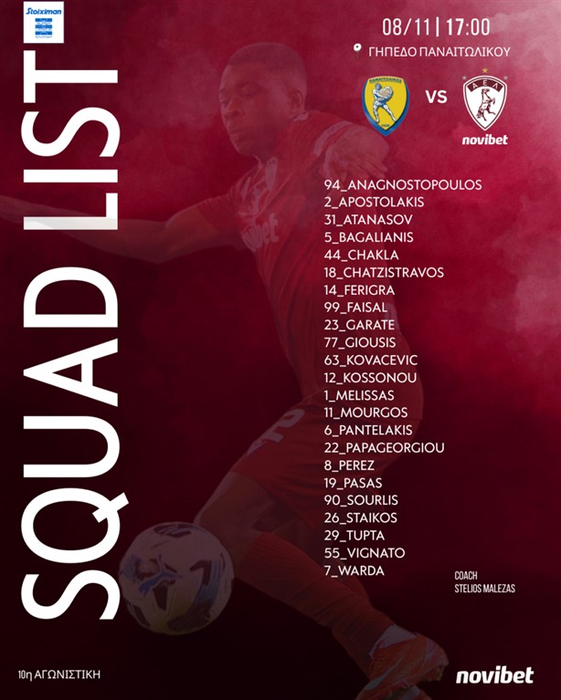 Οι Σαγάλ και Δεληγιαννίδης έμειναν εκτός λόγω τραυματισμών. Θλάση και οι δύο. Αντράντα λόγω περιορισμού στη θέση ξένων. Ηλιάδης για αγωνιστικούς λόγους.