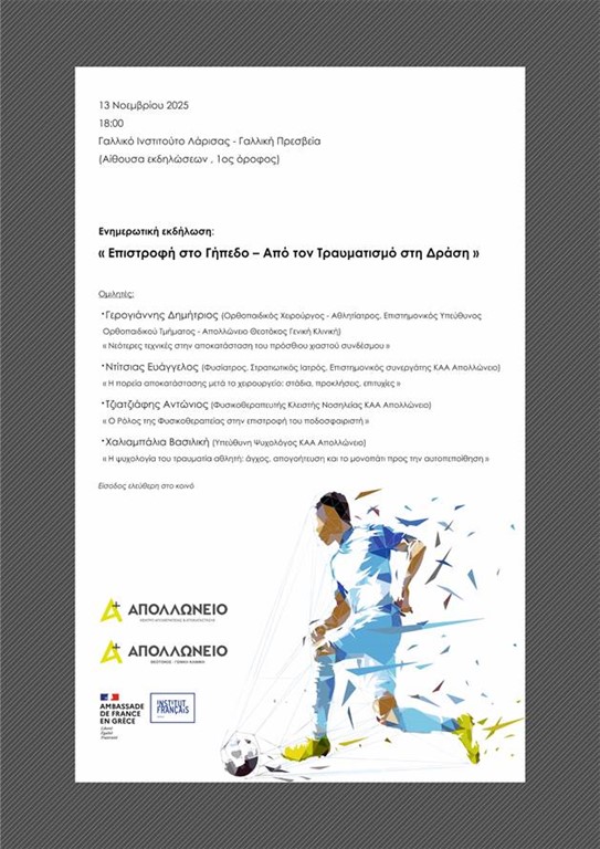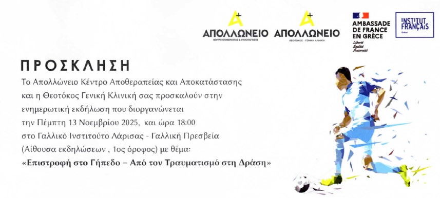 Ημερίδα για την επιστροφή στην ενεργό δράση των ποδοσφαιριστών μετά από τραυματισμό πραγματοποιεί την Πέμπτη 13 Νοεμβρίου 2025 και ώρα 18.00 στο Γαλλικό Ινστιτούτο το Απολλώνειο Κέντρο Αποθεραπείας και Αποκατάστασης.