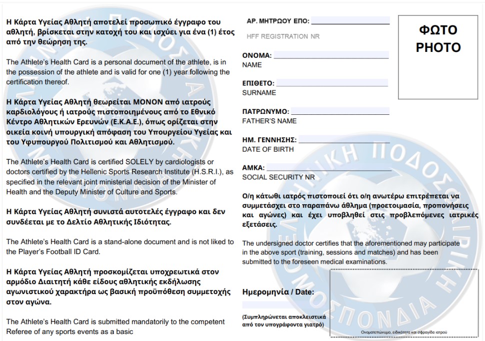 ” Όπως είχατε ενημερωθεί με αλληλογραφία τον Ιούλιο του 2023, θα πρέπει να γίνεται χρήση αποκλειστικώς του νέου εντύπου Κάρτας Υγείας Ποδοσφαιριστή και όχι του παλαιού.