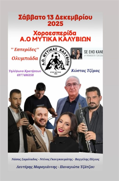 Το Σάββατο 13 Δεκεμβρίου ο ποδοσφαιρικός σύλλογος του Μύτικα Καλυβίων διοργανώνει την ετήσια χοροεσπερίδα του στο κέντρο «Εσπερίδες» στην Ολυμπιάδα.