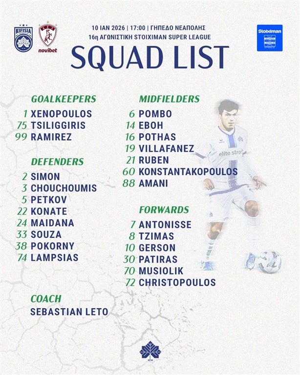 Αναλυτικά η αποστολή της Κηφισιάς για την αναμέτρηση με την ΑΕΛ Novibet.