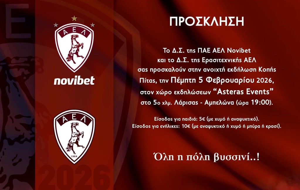 Το Διοικητικό Συμβούλιο της ΠΑΕ ΑΕΛ Novibet και το Διοικητικό Συμβούλιο της Ερασιτεχνικής ΑΕΛ, μαζί με όλα τα τμήματα και όλα τα αθλήματα του συλλόγου μας, θα πραγματοποιήσουν την καθιερωμένη κοπή της πρωτοχρονιάτικης πίτας την Πέμπτη 5 Φεβρουαρίου 2026, στις 19:00, στον χώρο εκδηλώσεων «Asteras Events» (5ο χλμ Λάρισας – Αμπελώνα).
