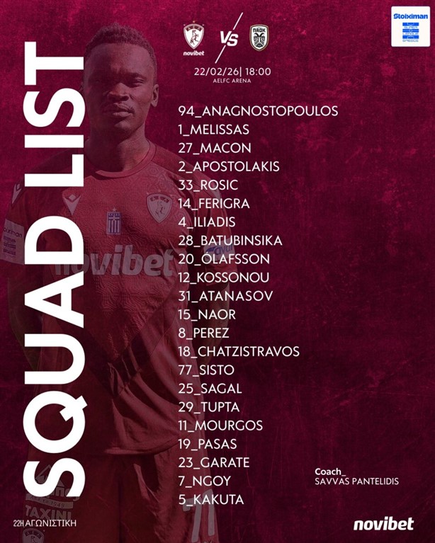 Οι 22 παίκτες που επέλεξε ο κ. Σάββας Παντελίδης είναι οι: Αναγνωστόπουλος, Μελίσσας, Μασόν, Αποστολάκης, Ρόσιτς Φερίγκρα, Ηλιάδης, Μπατουμπινσικά, Όλαφσον, Κοσονού, Σίστο, Ατανάσοφ, Ναόρ, Πέρεζ, Χατζηστραβός, Σαγάλ, Τούπτα, Μούργος, Πασάς, Γκαράτε, Ενγκόι, Κακουτά.