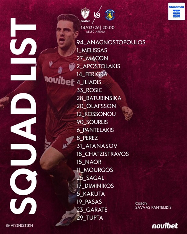 Οι 23 παίκτες που επέλεξε ο κ. Σάββας Παντελίδης είναι οι: Αναγνωστόπουλος, Μελίσσας, Μασόν, Αποστολάκης, Ρόσιτς, Φερίγκρα, Ηλιάδης, Μπατουμπινσικά, Παντελάκης, Όλαφσον, Κοσονού, Σουρλής, Ατανάσοφ, Ναόρ, Πέρεζ, Χατζηστραβός, Σαγάλ, Τούπτα, Μούργος, Πασάς, Γκαράτε, Κακουτά, Δημηνίκος.